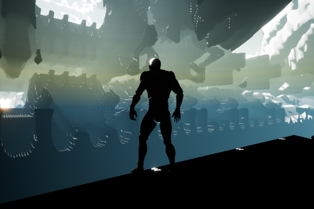 Using unreal engine, an excellent voxel plugin, and small C++ fractal library I pieced together, it was a simple matter of using the distance estimate to determine whether a region of space should be filled. Because each voxel is a cubic meter, much detail is lost even with the latest voxel smoothing algorithms. To add this detail back in, I created a custom material shader that uses raymarching from the surface of the voxel mesh to render the fractal with detail only limited by the number of pixels on the screen. This effectively creates a hybrid rendering system that allows traditional rasterized meshes to exist alongside, interact with, and theoretically even modify complex raymarched shapes.